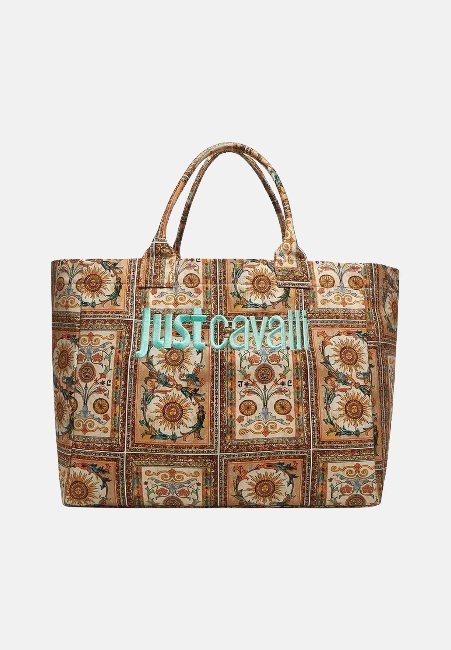 Borsa mare beige da donna realizzata in tessuto resistente con stampa decorativa all-over a riquadri, caratterizzata da motivi ornamentali, soli stilizzati ed elementi floreali nei toni del beige, marrone, ocra e turchese. La struttura è morbida ma capiente, ideale per contenere tutto l'occorrente da spiaggia o da giornata estiva. È dotata di doppi manici in tessuto coordinato, comodi per il trasporto a spalla o a mano. L'interno è foderato in tessuto chiaro e presenta una tasca interna con chiusura zip, pratica per riporre oggetti personali. Sul fronte spicca il logo Just Cavalli a contrasto, che aggiunge un tocco distintivo e riconoscibile al modello. Una borsa funzionale e stilosa, perfetta come borsa mare o shopper estiva.