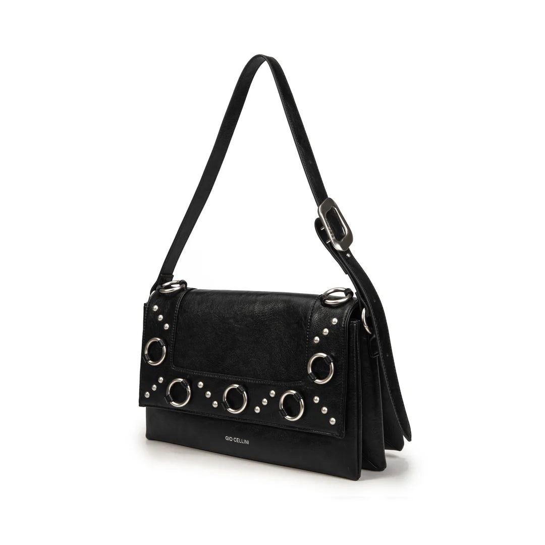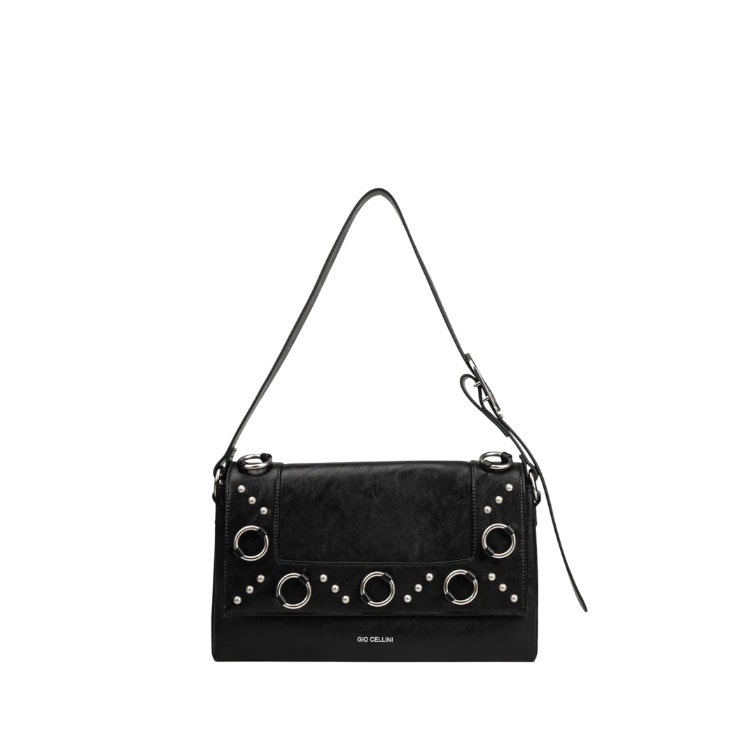 Borsa in ecopelle vintage con logo embossed argentato, chiusura con cerniera, tre tasche interne (di cui una con zip) e manico singolo. Perfetta per organizzare tutto con stile.
