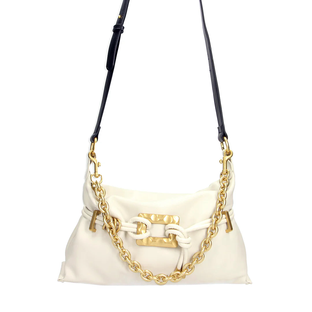 La chiusura con cerniera garantisce sicurezza, mentre il manico singolo e la tracolla regolabile offrono comfort e versatilità nell’uso quotidiano. La fibbia e la fascetta decorative completano il modello con un tocco di personalità e stile unico.