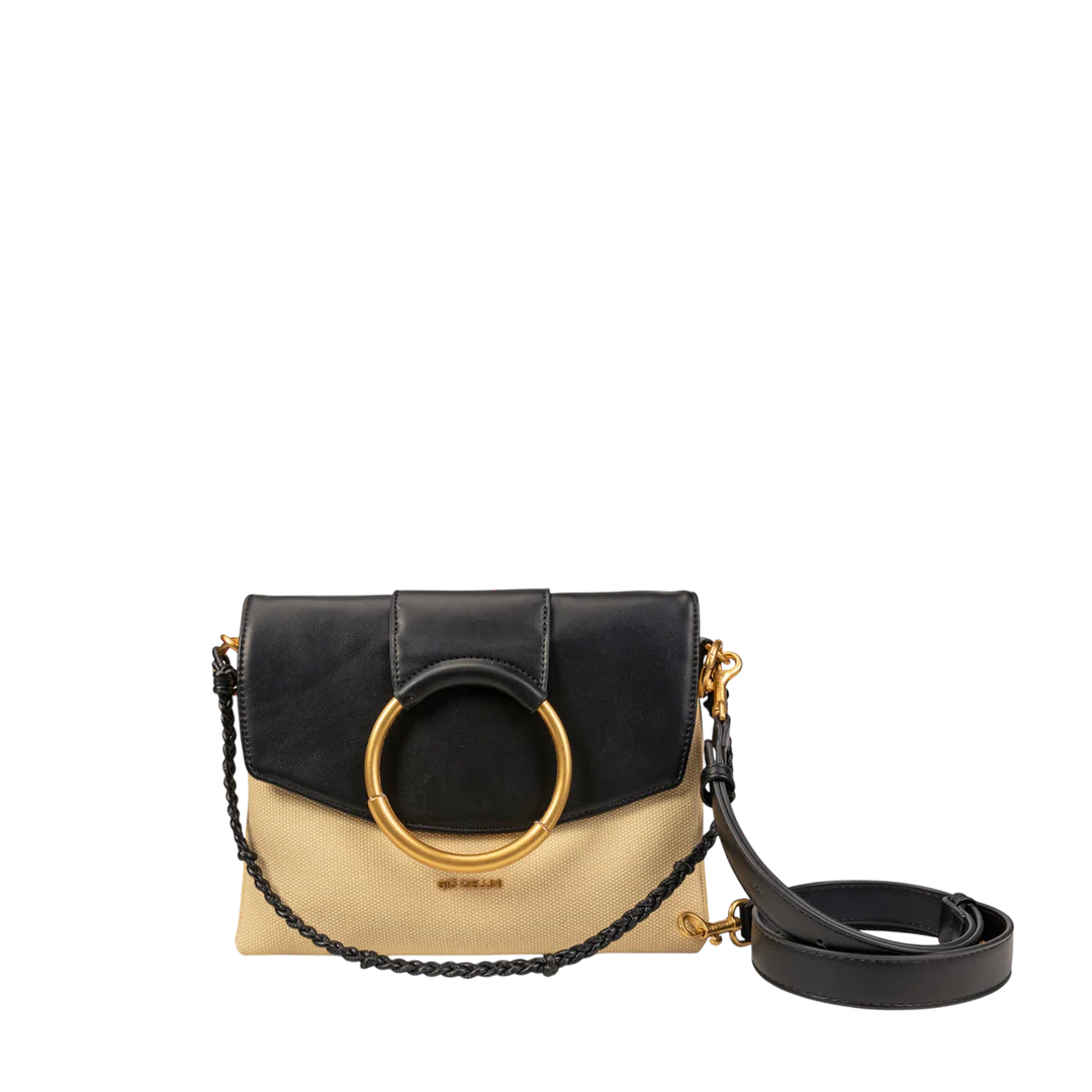 Mini bag in tessuto con logo lettering dorato, chiusura automatica, tre tasche interne (una con zip) e patta con anello decorativo. Ideale per portare con stile i tuoi essenziali.