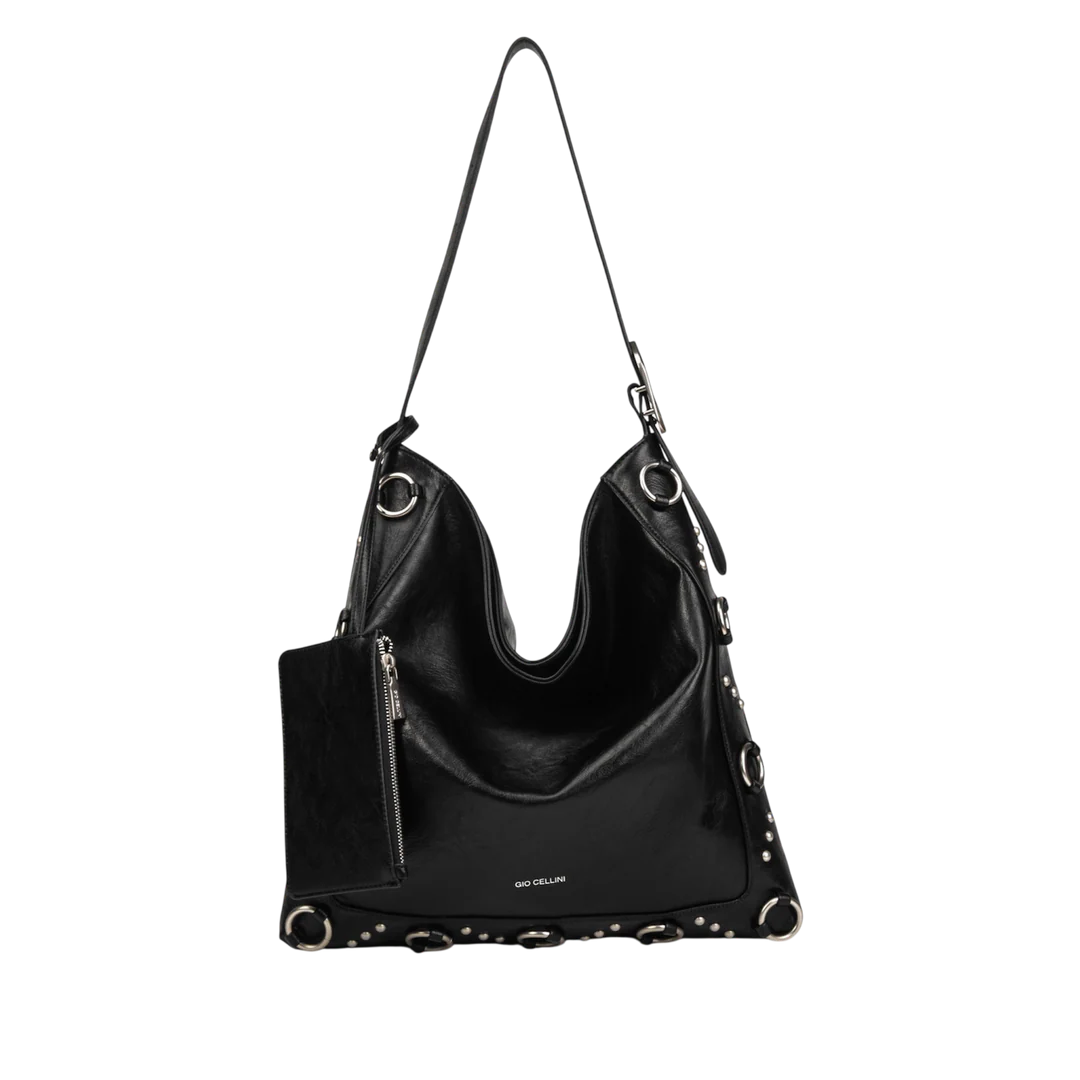 Moderna e funzionale, questa shopper in denim nero firmata GIO CELLINI unisce eleganza e versatilità. Il logo embossed con finitura argentata valorizza il design con un dettaglio distintivo e contemporaneo.